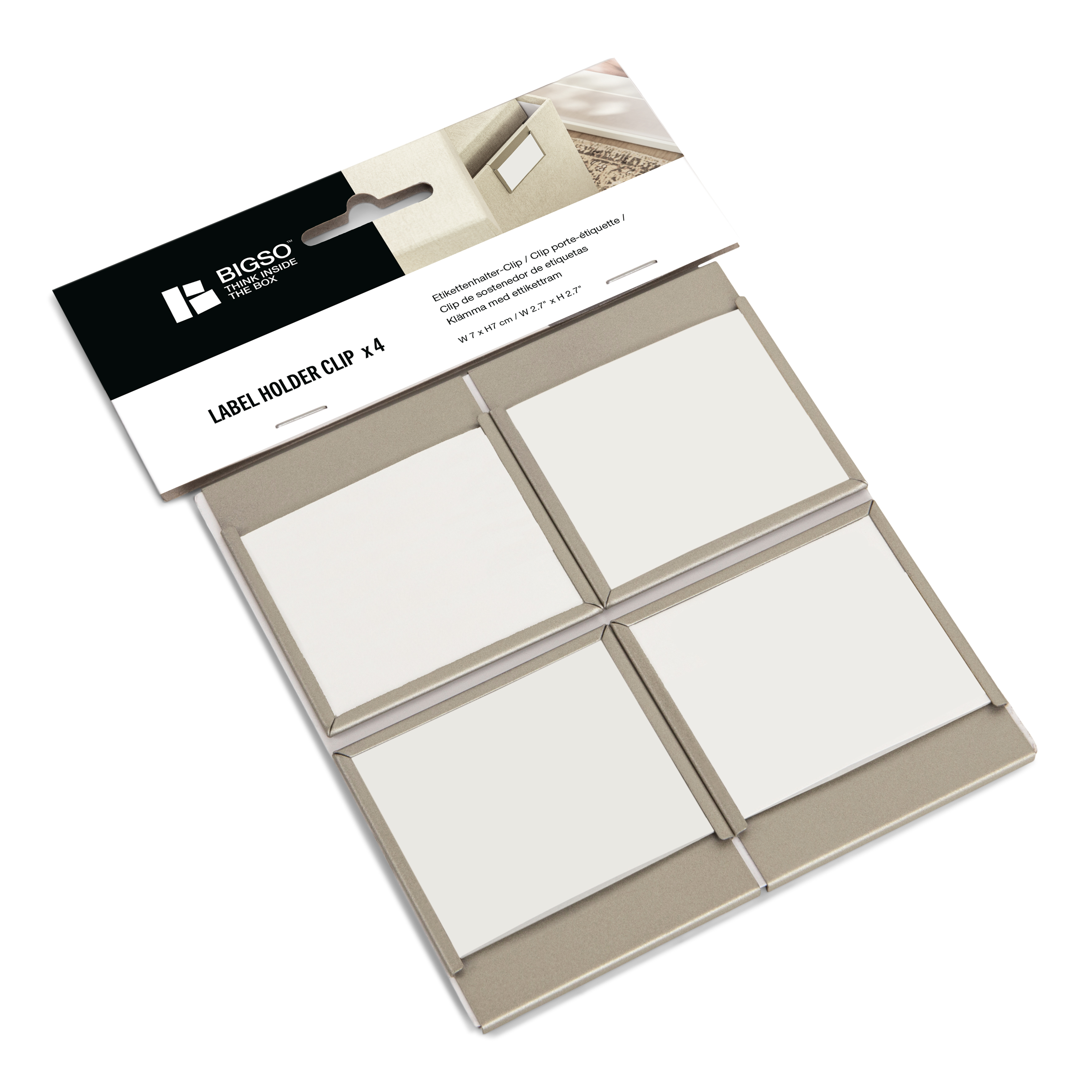 4-pack label holder clips A practical set of label holders with a large writing surface, designed to make organization simple and efficient. The clips attach securely to the edge of boxes, allowing for easy labeling and quick identification of contents. Finished in our signature Bigso satin grey color, matching perfectly with our standard frames and handles for a coordinated look.