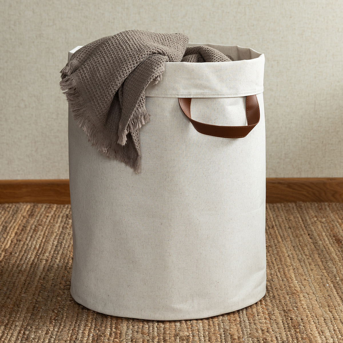 This spacious Floor Storage Basket combines thoughtful design with everyday usefulness. It comes in two timeless colors, a warm light linen and a subtle grey, and blends effortlessly into any home style.