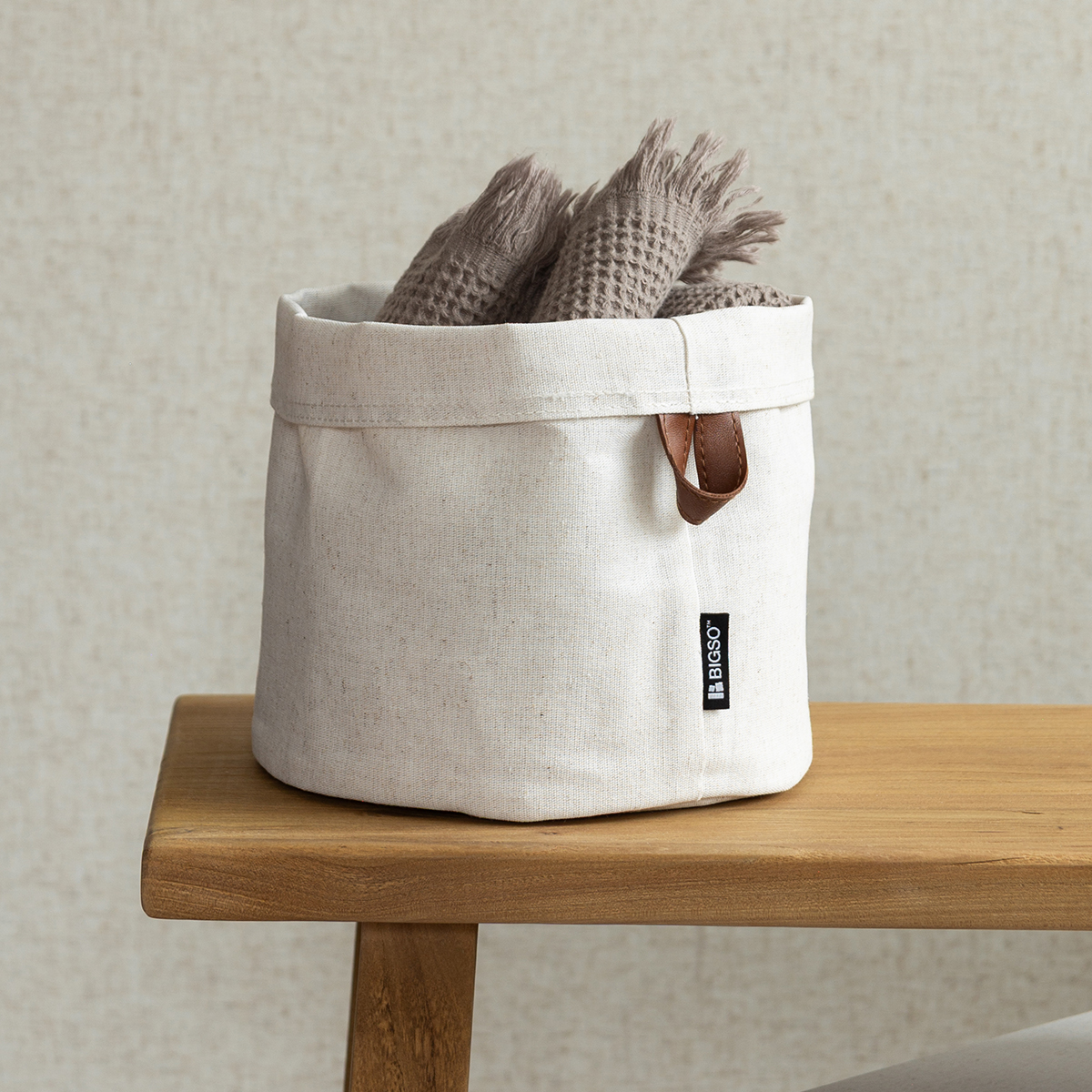 This round basket is perfect for storing items such as scarves, towels, or toys. It keeps your space tidy while adding a soft and stylish accent. With its timeless look and neutral textile finish, it fits beautifully in living rooms, bedrooms, and bathrooms alike. The two colors come with a brown handle on the linen basket and a black one on the grey.